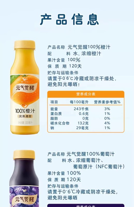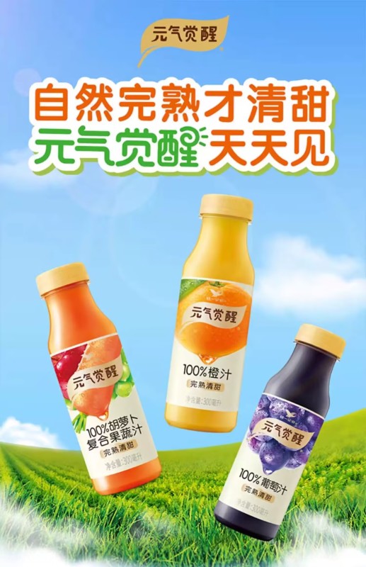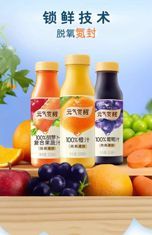 Unify vitality and awaken 100% orange juice, grape juice and carrot juice.