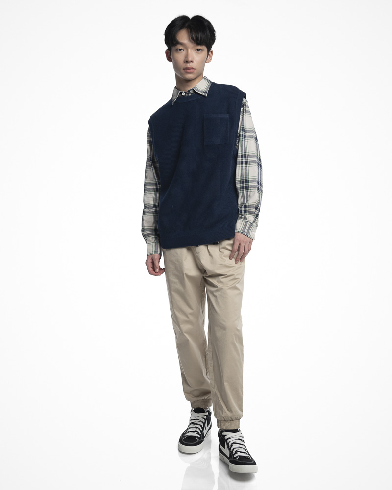Yishion Men Knitted Round Neck Vest with Chest Pocket and Ribbed Hem (Dark Blue)