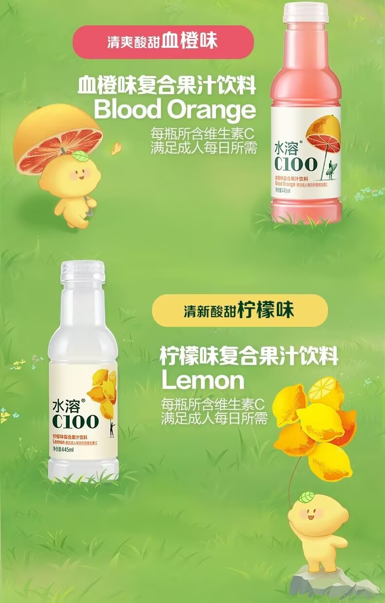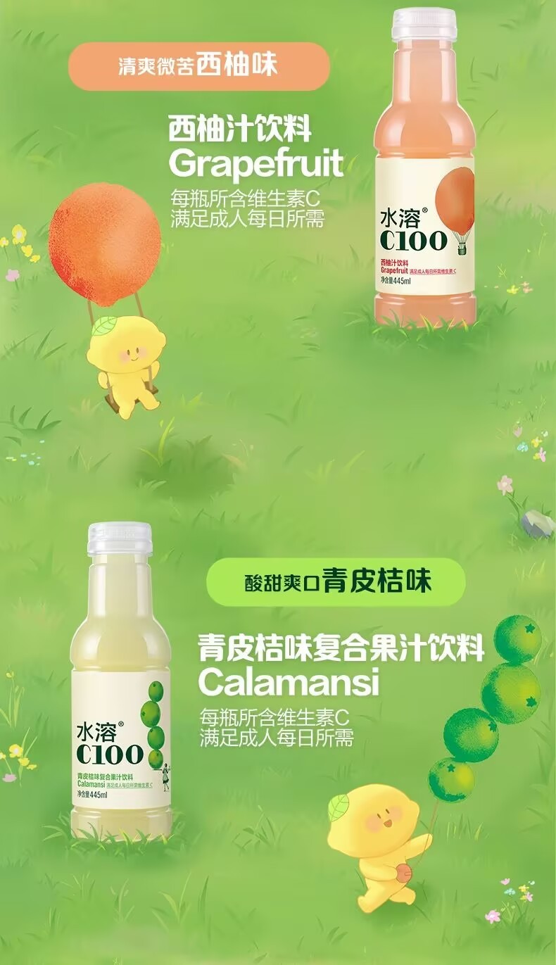 Nongfu Spring water-soluble C100 compound juice beverage with green peel and orange flavor 445ml*15 bottles packed in a container.