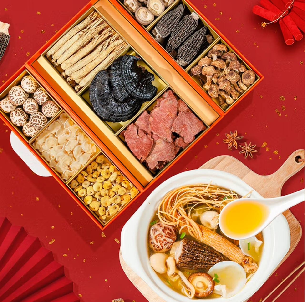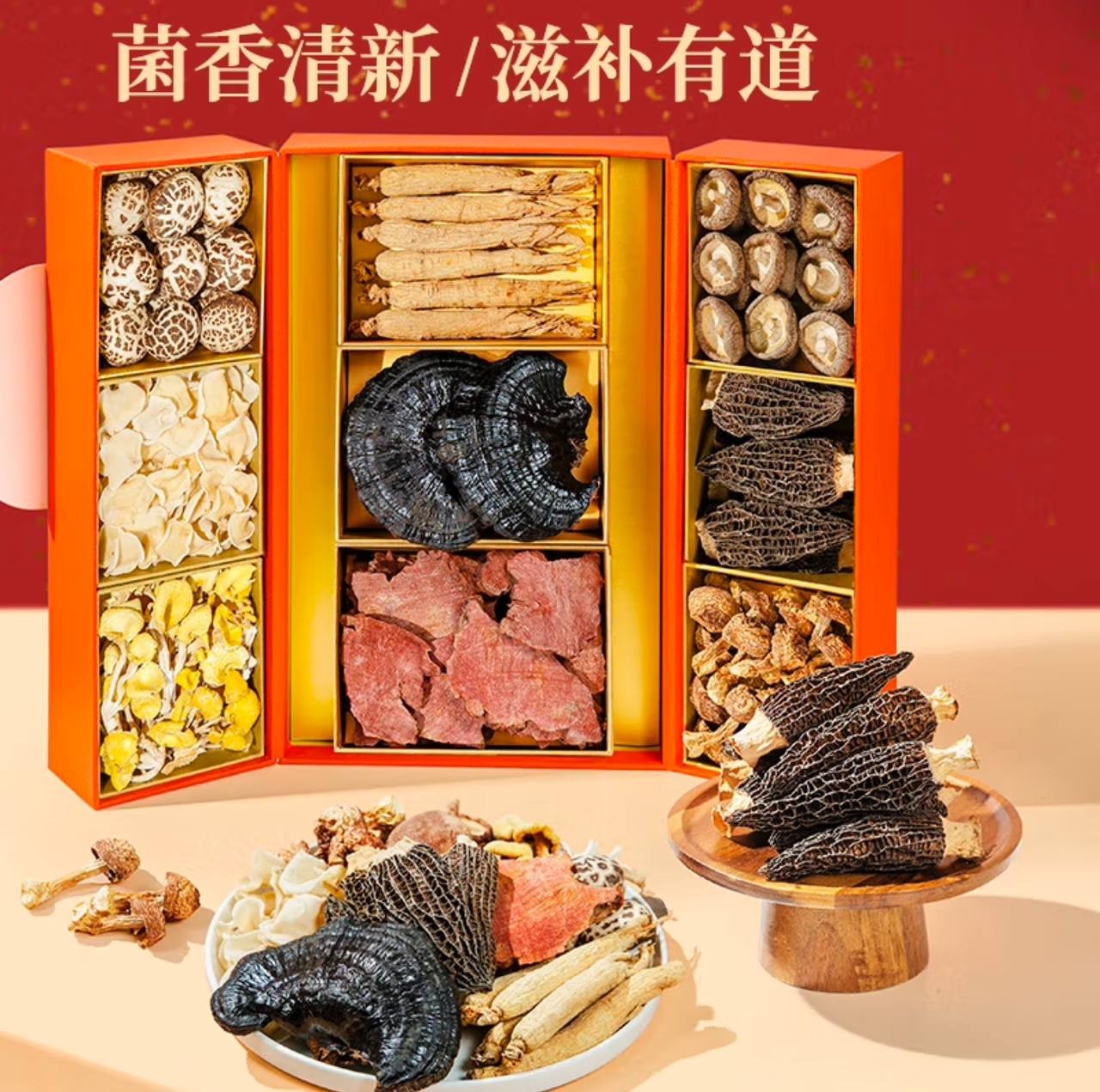 Zhenxi Mountain Mushroom Gift Box Double Door Ganoderma Lucidum Ginseng Dry Goods 9 Pieces 745g Holiday Gift Box for Elders